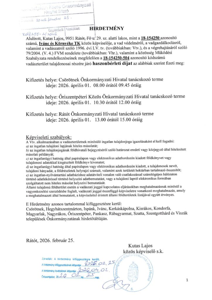 Hirdetmény Ivánc és Környéke TK haszonbérleti díj kifizetéséről